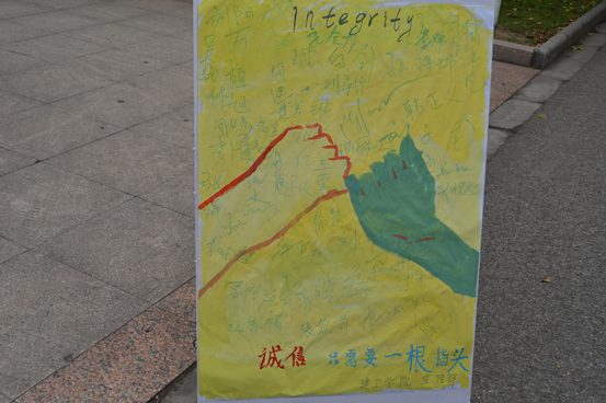 英语三级B、四六级考试和期末考试即将来临,为严肃考风、考纪,提高学生的自身修养,建工学院开展了以“文明考风,诚信考试”为主题的宣传教育活动。