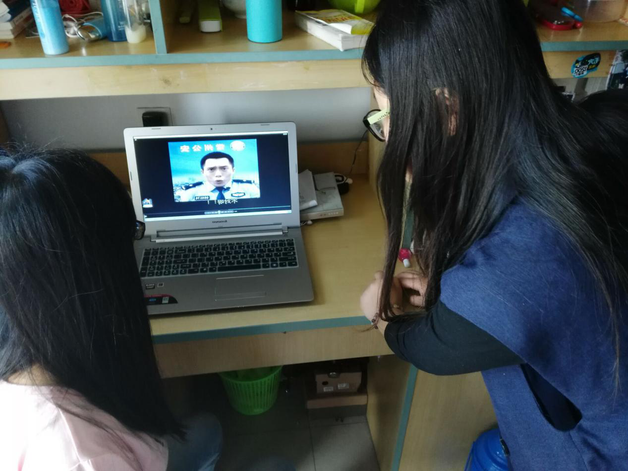 在班级会议中,利用教室多媒体播放视频,在宿舍,学生利用笔记本电脑观看视频,视频中民警用幽默的语言描述了预防网络诈骗的多种情形,向学生讲解常见的网络诈骗手段以及预防网络诈骗的方法,提醒学生不要轻信陌生人,涉及钱财要慎重,不要泄露自己和家人的信息、账号、密码。