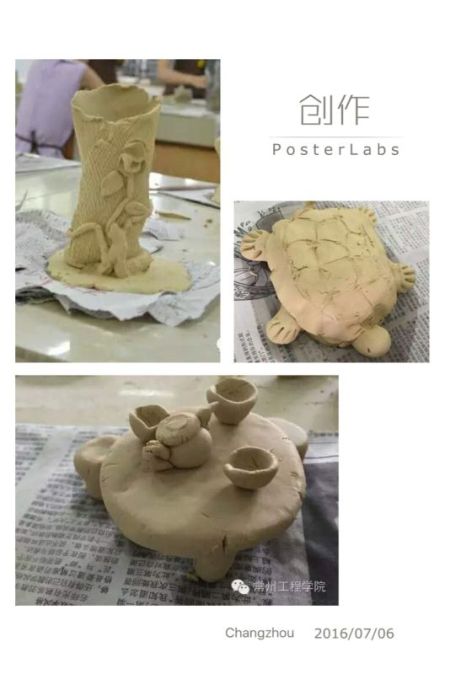 上午活动没开始,家长和小朋友们就早早到达现场,爸爸妈妈们互相交流分享着家里宝宝的趣事,小朋友们也很快打成一片,活动现场热闹而温馨,丝毫没受近日连续阴雨天气的影响。活动开始后,小朋友纷纷围绕着陶艺指导老师,认真听着讲解,深怕漏了一些重要的环节,爸爸妈妈们也丝毫不敢懈怠,跟着一起学习。听完讲解后,小朋友们各自领着陶泥找到自己的桌子开始认真“制作”起来,爸爸妈妈们也在一边认真“协助”,他们在各自完成自己作品的同时,还不忘互相走动学习,专业指导老师全程指导。几个小时后,各式各样的陶艺作品诞生了,有小动物、人物、花瓶、茶具等等,虽然大部分小朋友是第一次做陶艺,手艺还不娴熟,但是他们的想象力和创造力让我们惊叹,也让我们感叹常工程二代萌娃们的无穷潜力,这里,让我们一起祝愿他们永远健康快乐。