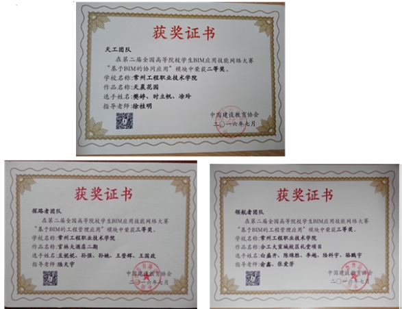 大赛期间,我院三支参赛队伍充分利用业余时间,在专业老师的指导下,根据自身的专业特长,分组选定工程图纸和相关软件。前期运用BIM技术建模,并进行后期施工组织编制、碰撞检查、造价成本分析等。八月初,大赛组委会传来佳讯,建工学院徐桂明、陆天宇、俞鑫、张爱芳四位老师带领的三支队伍均获佳绩,其中“时立帆、凃玲、樊婷”组成的天工队荣获二等奖,其他两支队伍获得了三等奖,我校综合比赛成绩在高职组名列前茅!九月初,师生们收到了组委会寄来的证书。