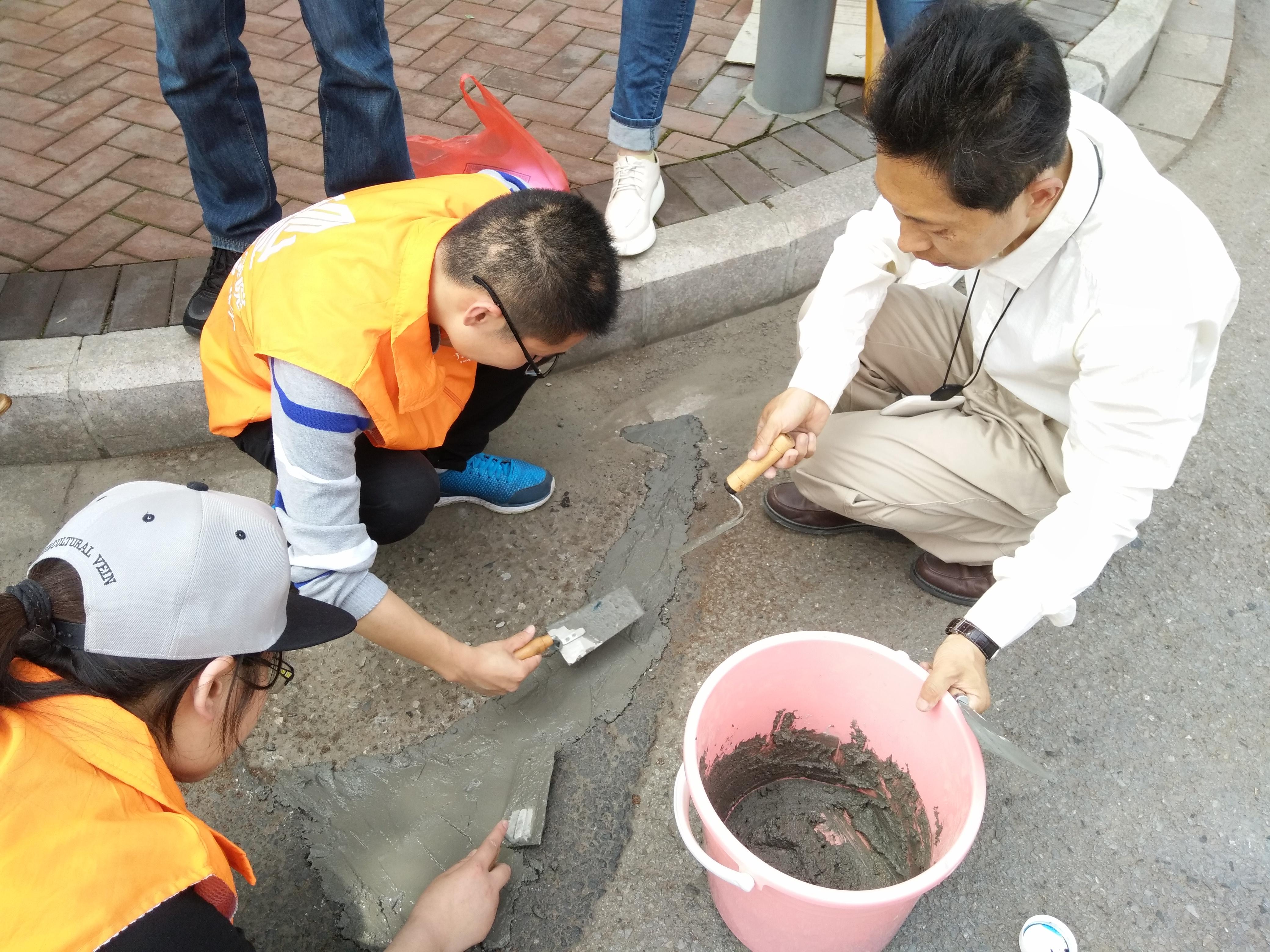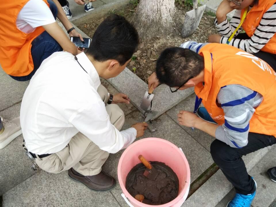下午1点30分,天工楼下两宣传栏之间站满了身着建工学院志愿者服装的同学们。活动开始,首先由程伟副书记简单地介绍了出席本次活动领导,随后,学工处窦苏明副处长作了重要讲话,窦副处长对建工学院所开展的“特色早自习”活动进行了表扬,对建工学院为校园环境维护所做出的贡献给予了肯定,还对本次校园环境维护工作提出了指导意见和给予了厚望。同学们听了都纷纷点头赞同,现场掌声热烈;随后,现场举行了授旗仪式,孙津津副书记给建工学院“方圆志愿者校园建筑环境维护队”授旗,并由后勤服务中心黄主任赠送劳动工具。紧接着,志愿者代表周益同学发言,他主要说到了“感谢”、“自豪”、“行动”三个关键词,并激励同学们为校园环境维护出一份力,并带领全体成员集体宣誓。活动的最后,张书记宣布,本次建工学院校园环境维护活动正式开始。张书记亲自带领和指导校园环境护卫队开展实践活动,在校园内修补路面、路牙等破损的建筑物,得到路过的师生一致好评。
