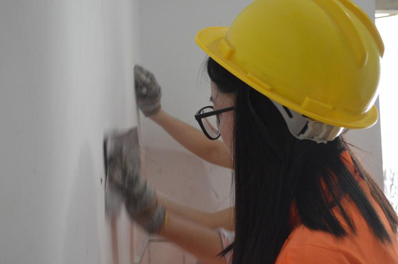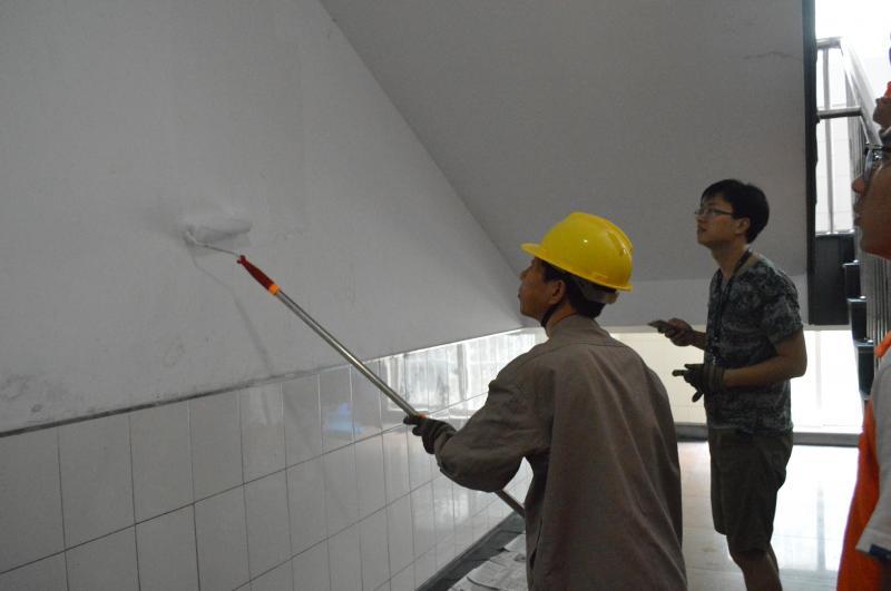 连续两天下午,建工学院的志愿者们在张卫平书记和程伟副书记的带领下,来到学院各宿舍楼首先进行墙面污点清洁,然后进行一一粉刷。活动开始,首先由张书记分配任务并对去污和粉刷细节进行讲解示范,志愿者们认真聆听和模仿。在劳动过程中,这些从未有过粉刷墙面经验的志愿者,干起活来有模有样,并不妨碍他们挥舞手中的滚刷,他们在两位领导的带领下对各宿舍楼的楼道和走廊墙面进行清洁和粉刷,使污迹斑斑的墙面重新变得干净靓丽,他们用汗水向同学诠释了爱,用劳动为校园创造美丽。