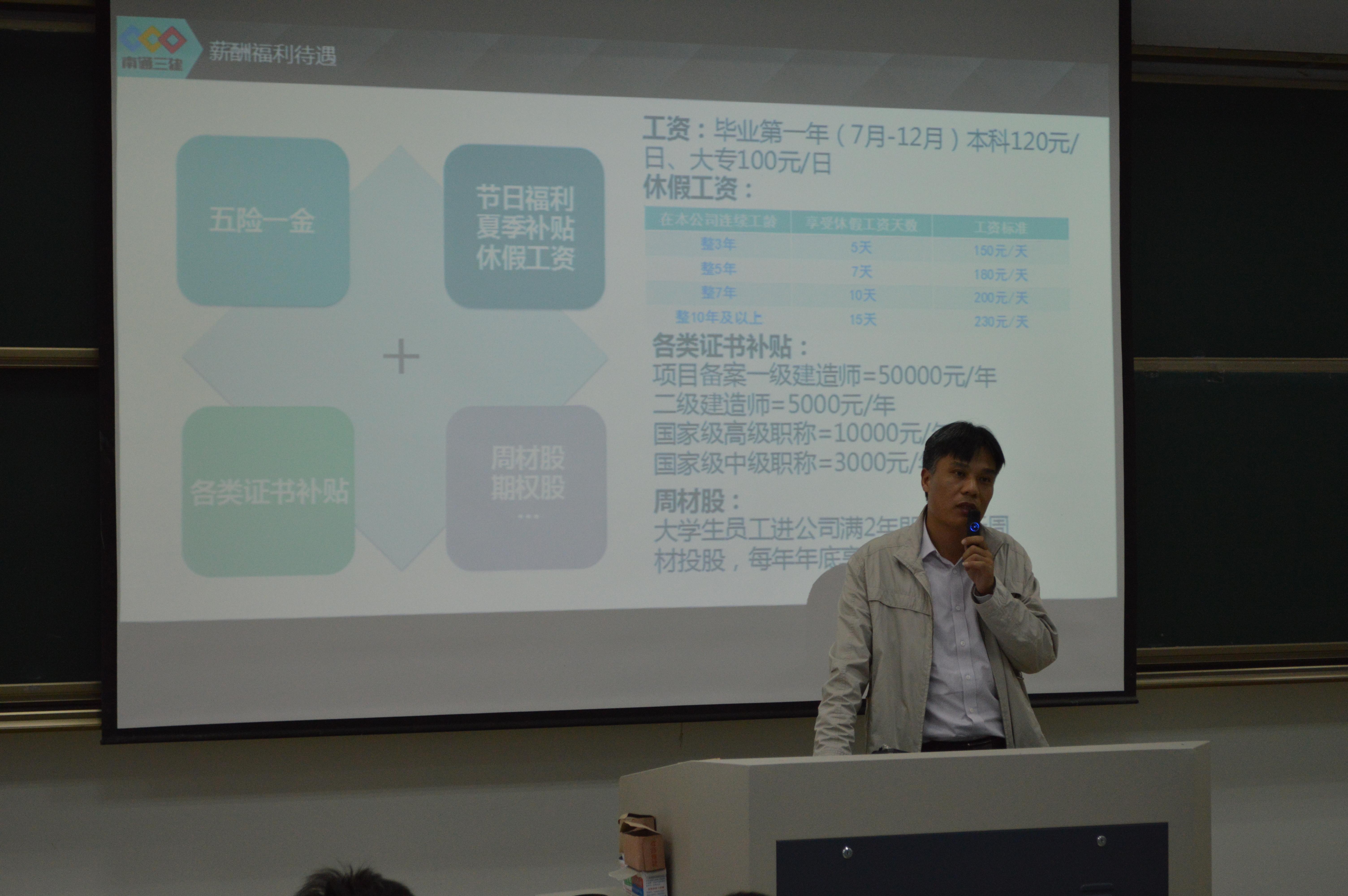 江苏南通三建集团股份有限公司, 是一家拥有建筑设计施工、地产开发运营、金融投资、电子商务、教育培训等完整产业链的大型企业集团。此次公司招聘主要岗位为技术、施工人员、预决算人员,面向市政、土建、监理等相关专业,吸引了200多名毕业生前来参加宣讲会。宣讲会上,南通三建殷总详细介绍了企业背景、未来发展空间,并介绍了招聘岗位和要求,学生们对企业的精彩讲解产生了浓厚的兴趣,针对薪资待遇、岗位成长空间、海外项目等关心的问题和企业进行了深入的沟通,会后多名学生和企业招聘人员进行了深入交流。