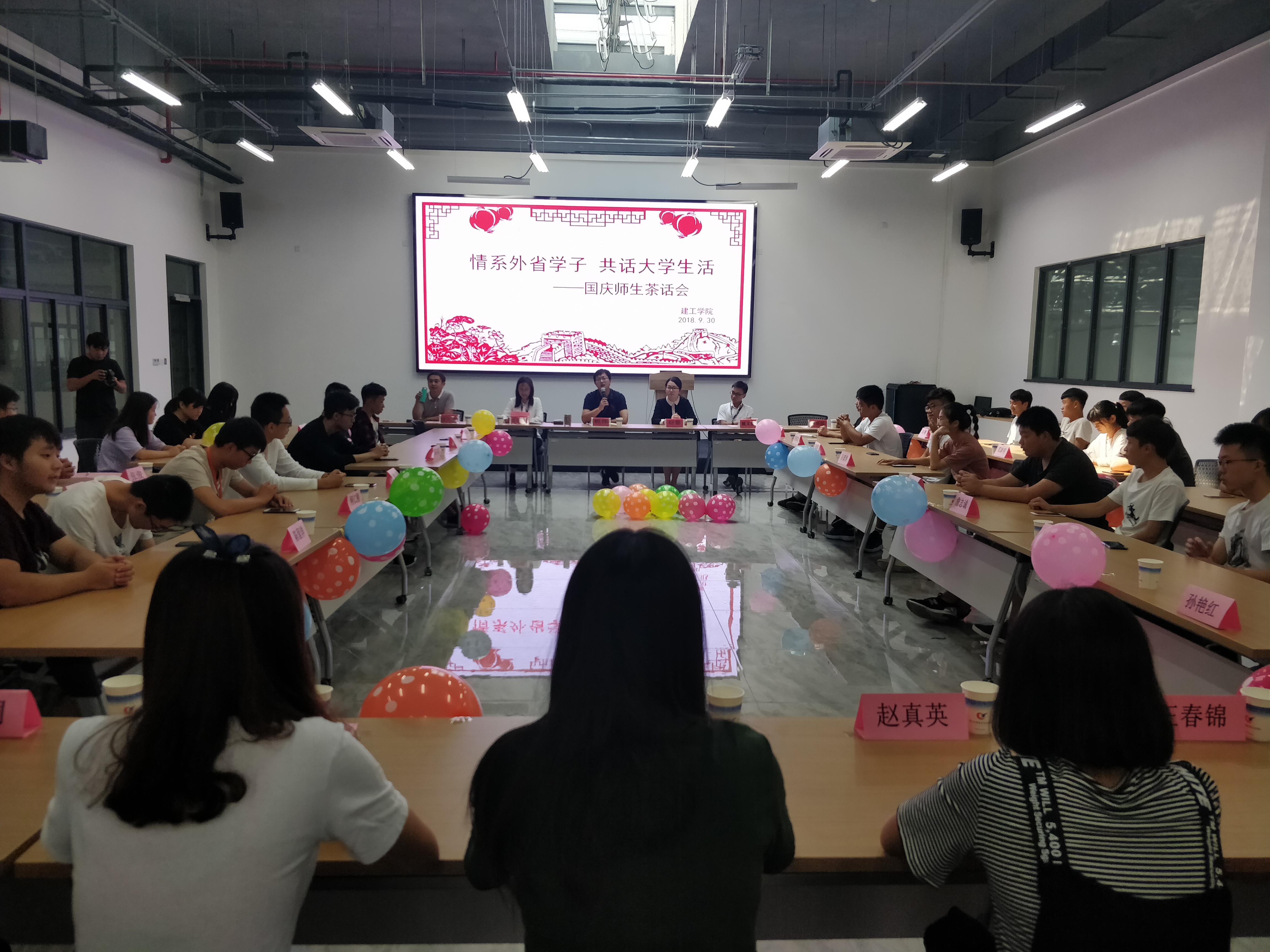 为使2018级外省新生感受到异乡的温暖,更好的适应大学生活,同时使学院领导及老师更清楚地了解和掌握学生在思想、学习和生活方面的需求情况,9月30日下午,建工学院在现代技术馆313举办了18级外省学生庆国庆师生茶话会。建工学院党总支副书记程伟、辅导员、班主任与来自不同专业、民族、省份的42名新生欢聚一堂,共庆佳节。茶话会由辅导员周丽娟老师主持。