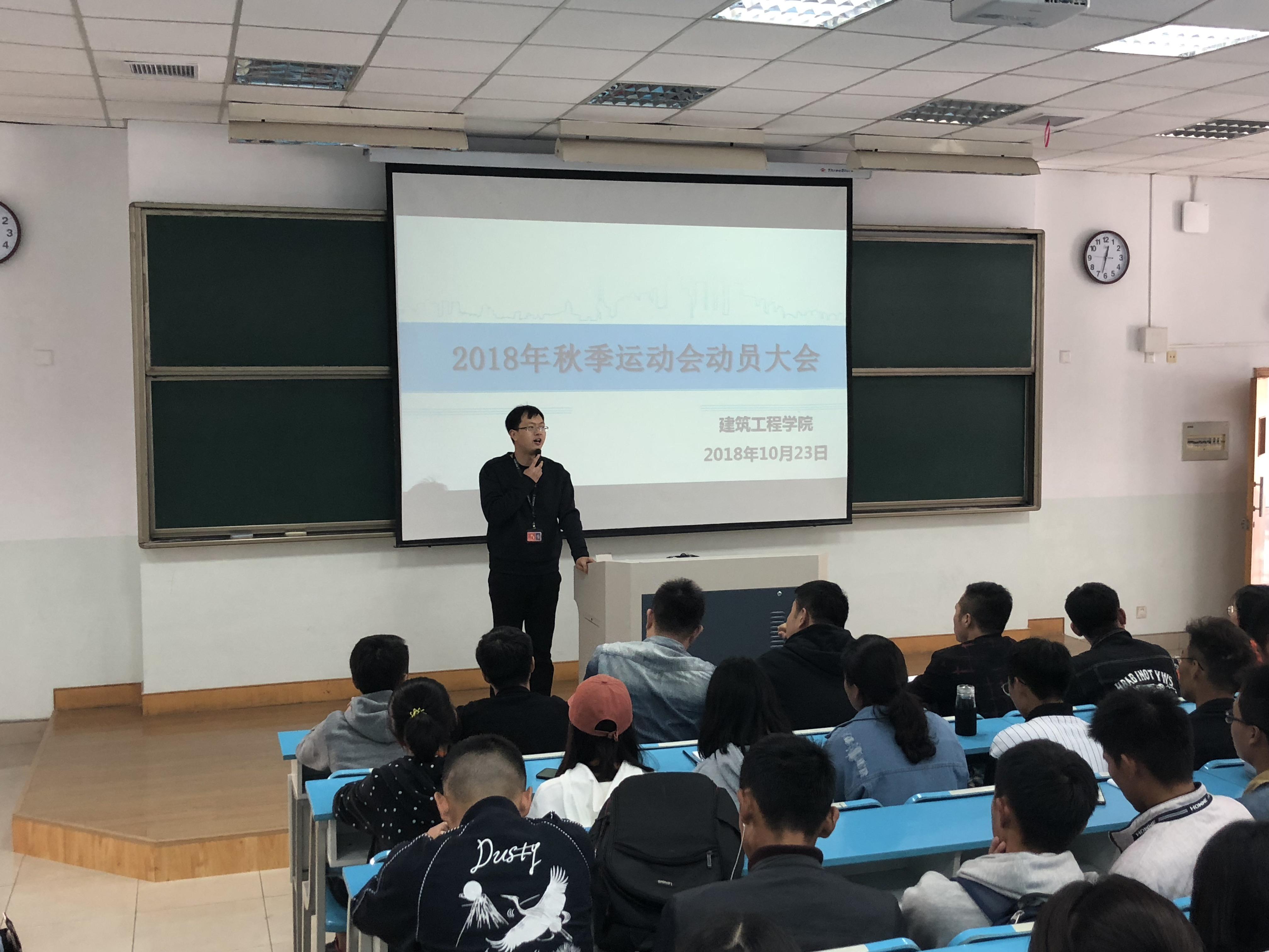 金秋十月,丹桂飘香!在第十七届秋季运动会即将到来之际,为充分调动运动员的比赛情绪,同时保障比赛期间各项服务工作的有序进行。2018年10月23日中午12:30,“建工学院2018年校运会运动员动员大会”在教学楼第一阶梯教室举行。党总支副书记程伟、学工办老师谢旭东、建工学院学生会干部及全体参赛运动员参加了本次会议。