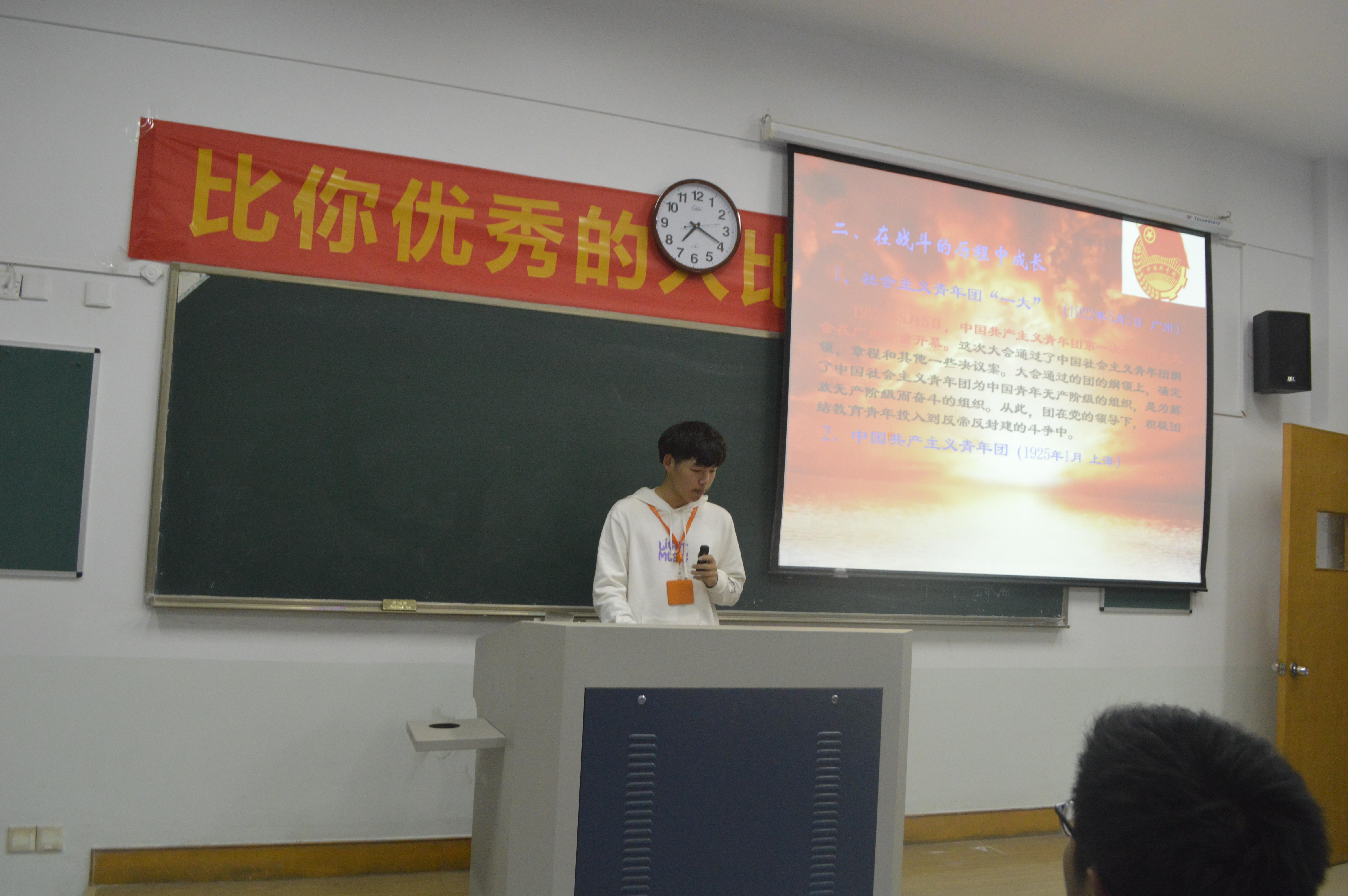 晚上七点整,本次团课活动在教学楼正式拉开了帷幕。本次团课活动在各班团支书的主持下正式开始。首先,各班团支书为大家播放了一段视频:“五四运动”、“一二九爱国救亡运动”……一张张历史的遗照让我们了解到共青团相关信息。熟悉的团歌响起,全体同学站立握拳宣誓并吟唱团歌。接着,团支书就本次团课向同学们阐述了自己的观点,提出学做合格共青团团员,要从自身出发。学好专业课程是第一要点;同时要树立好正确的三观;明确目标,踏实走好每一步;在前进的路途中时刻反省自己,总结并纠正自己;自律自己不可懈怠。接着,团支书又向大家阐述了习近平总书记对当代少年的寄语,让同学们明确当代青年的使命,要坚定理想信念,练就过硬本领,锤炼高尚品德,并积极响应“时代召唤青年,青年创造未来”的口号,做一名合格的共青团员。活动最后,团支书激励同学们要时刻牢记,把命运掌握在自己手中,不忘初心、牢记使命。团课中,同学们认真听讲,掌声不断。