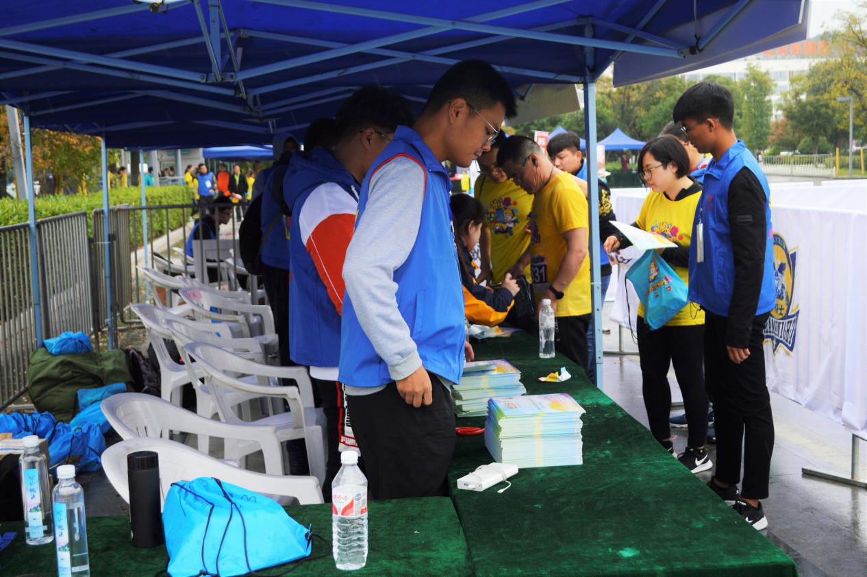 早上五点半,建工学院志愿者们前往活动现场,被派往起终点以及各个补给站,负责为路过补给站的选手们盖章打卡、分发补给,并为选手鼓劲加油。随着活动继续,天空渐渐飘起小雨,长跑之路更加艰难,陆续出现选手摔倒、身体不适等情况,志愿者第一时间对他们进行搀扶、慰问,引导选手到蓝天救援队进行医疗处理。