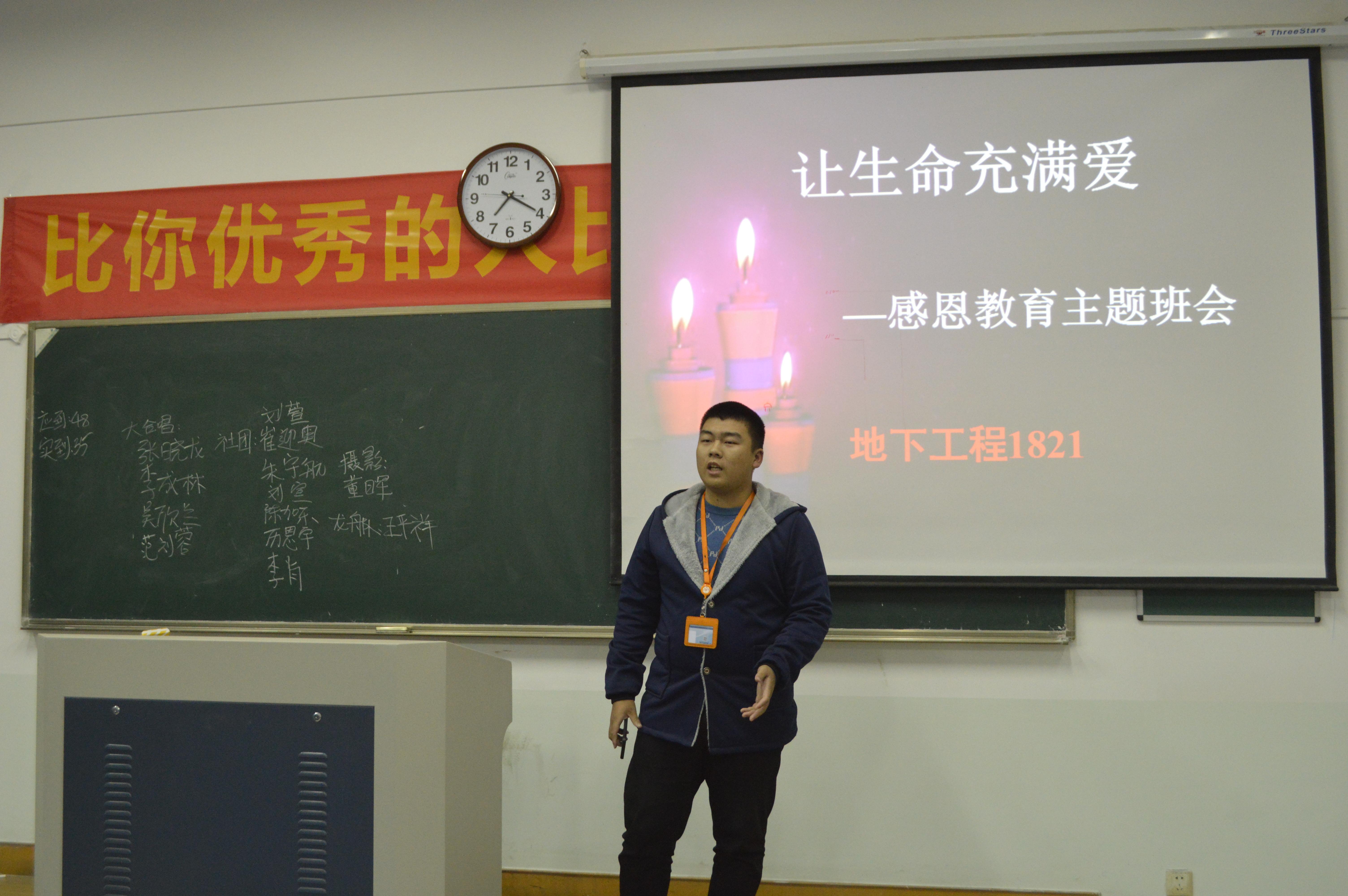 为了弘扬中华民族传统文化,使学生更深刻的认识到现在生活的来之不易,常怀一颗感恩之心,11月22日晚,建工学院开展“感恩之心 常伴吾身”主题教育班会。 活动中,同学们分别对围绕“感恩”一词做出了深刻的理解,她们的主题各有千秋,有感恩父母、老师、同学、朋友、学校、社会等。其中地下1821班洪明杰同学提出“羊有跪乳之恩,鸦有反哺之义”,感恩的最初必是源自我们的父母,从出生到成长的一路上我们受尽来自父母的恩惠,孝顺父母长辈自然是首当其冲;建工1821班陈多多同学认为感恩不止体现于我们周围的生活环境,更是一种家国天下的情怀。我们生活的世界中,每一寸都注入了别人的付诸与努力,我们要珍惜当下生活,以实际回馈这个世界。 此次活动的开展,不仅加深了同学们对感恩的理解与认知,构建了建工学院的人文素质的培养,更让同学们深刻理解到要常怀感恩之心、感恩之情,感恩那些关心你的每一个人,友好善良的笑对明天,珍惜美好的一切。(建工学院 谢旭东 张颖/文 朱陈龙/摄)