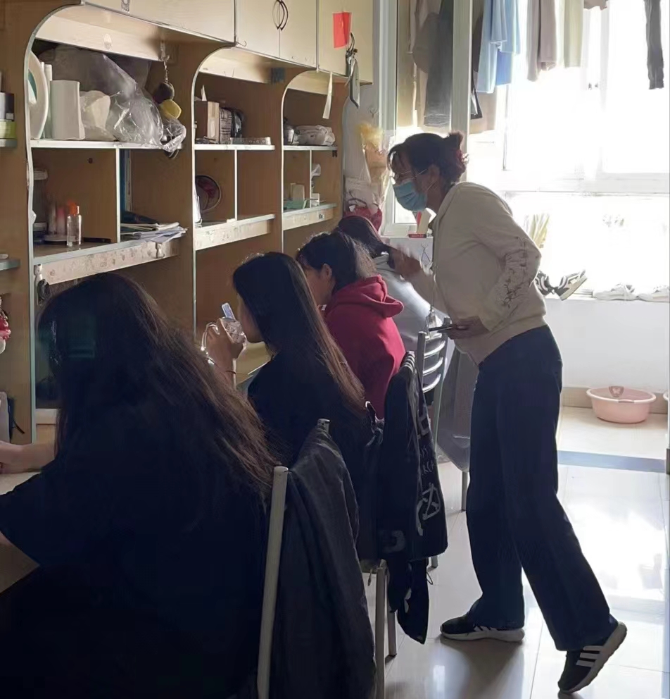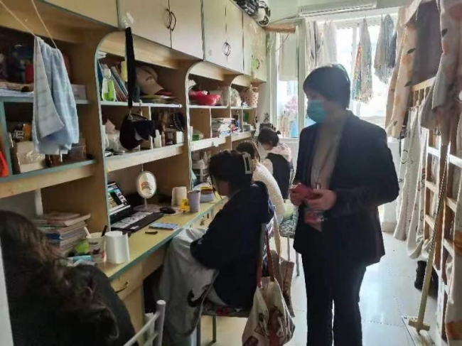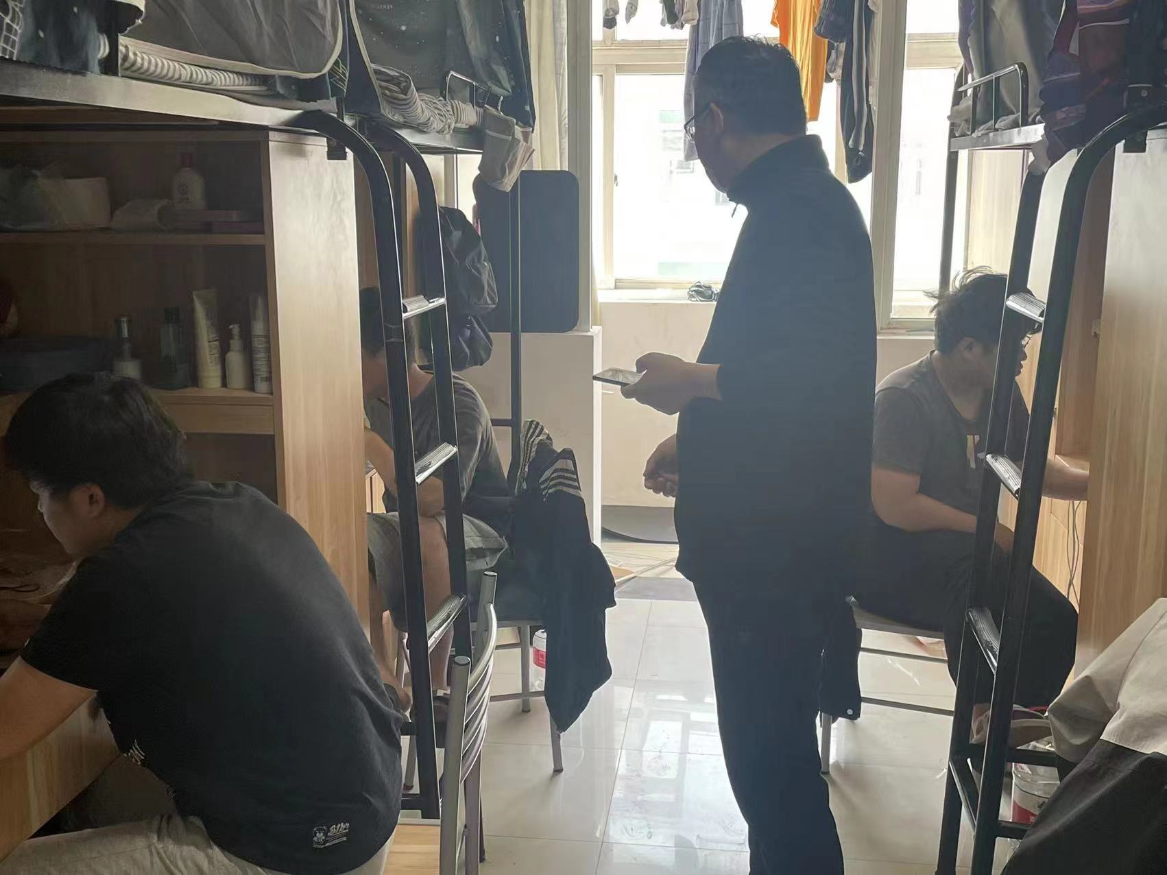 建工学院党政领导班子带领住校辅导员一起下学生公寓,与学生面对面互动,查看卫生情况、上课情况,宣讲疫情防控知识,鼓励学生积极进行体育锻炼等。