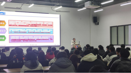 随后,2022级年级辅导员李艺从营造良好学风出发,强调早晚自习纪律和旷课严重后果,要求学习委员认真做好班级课堂出勤考核;2021级年级辅导员杨军华督促同学们把精力放在学习和不断提升自己能力上,提前做好实习或学历提升的准备。