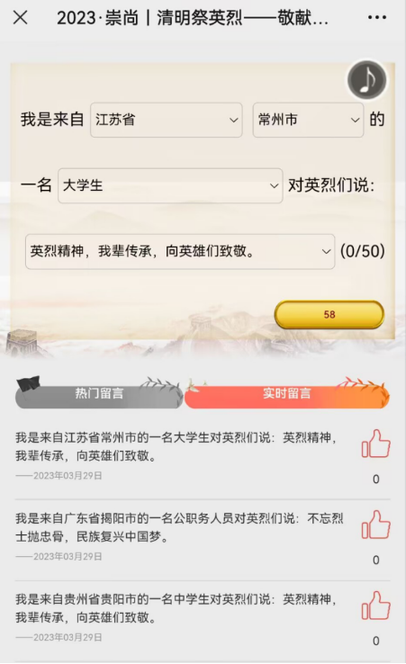 网上祭扫英烈 弘扬时代新风。3月29日以来,建工学院开展“2023·崇尚·清明祭英烈”网上祭扫活动,引导同学们自觉缅怀、纪念、尊崇、学习英雄烈士,厚植爱党、爱国、爱社会主义情感。活动发布后,建工学子纷纷向英烈敬献鲜花、书写“岁月悠悠,英魂永存”等寄语,寄托哀思,致敬英雄。此次“网上祭英烈”活动,以更文明、更绿色、更健康的祭奠方式,表达出对革命先烈的缅怀之情。