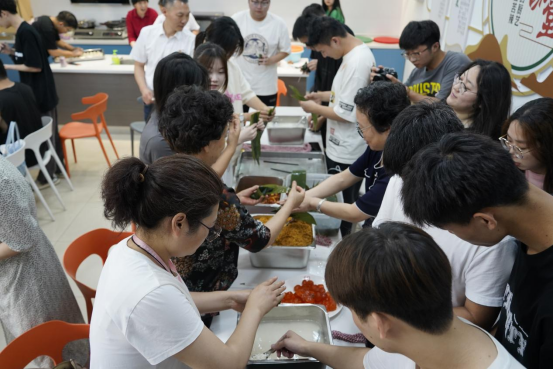 活动现场,糯米、粽叶、馅料等包粽子的材料在桌上摆放得满满当当,社区党员和学校老师作为包粽“导师”,细心指导同学们如何包出一个结实美观的粽子。包粽子的手法,一折叶、二盛料、三压实、四包、五扎绳,看似简单的步骤,却处处充满了不易。同学们根据老师的做法,有模有样的开始折叠粽叶,填放食材,包裹成型,扎紧绳索,一颗颗饱含祝福的粽子相继诞生。当天正值夏至,社区党员代表们和同学们起了包饺子,大家各有各的包法,包出来的饺子也各式各样,精美别致。饺香、粽香营造出浓浓的佳节氛围,拉近了大家之间的距离。整个活动现场气氛融洽,师生互帮互助,全程伴随着节日的欢声笑语,大家对节日的浓浓期许和祝福,也融入到了小小的饺子、粽子中去。