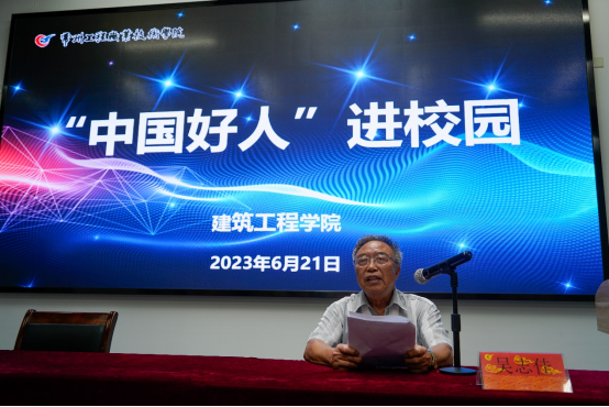 “中国好人”进校园,润物无声扬新风。来自共建单位区西直街社区的的老党员吴志佳先生,曾获得“常州市老年之星”、“常州好人”、“江苏好人”、“中国好人”等荣誉称号。82岁的“中国好人”吴志佳目睹了祖国翻天覆地的变化,他表达了对当下美好生活的赞许和对党的感激之情,分享了自己义务修伞、参与抗疫服务的经历,用真挚的感情、质朴的语言讲述了自己一生不图名利、坚持十八年如一日做好事的感人事迹。他的故事深深感染了在场的每一个人,让助人为乐和志愿服务的种子在建工师生心中悄然生长,也增强了广大青年学生的社会责任感和历史使命感,激励了广大青年学生奋勇争先、扎根基层、服务社会!