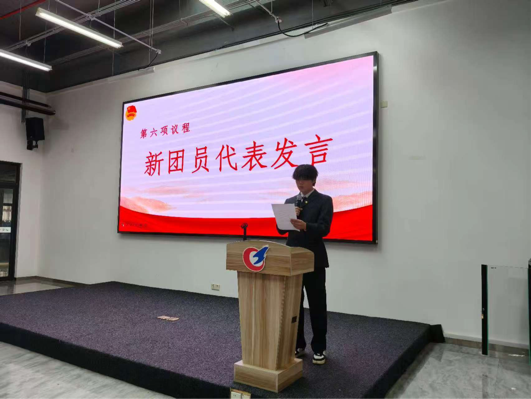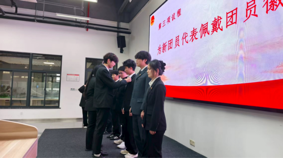 仪式在庄严的国歌声中拉开序幕,全体人员肃立致敬,激昂的旋律奏响了青春奋进的序曲。新团员名单宣读完毕后,老团员代表为新团员代表佩戴团徽。